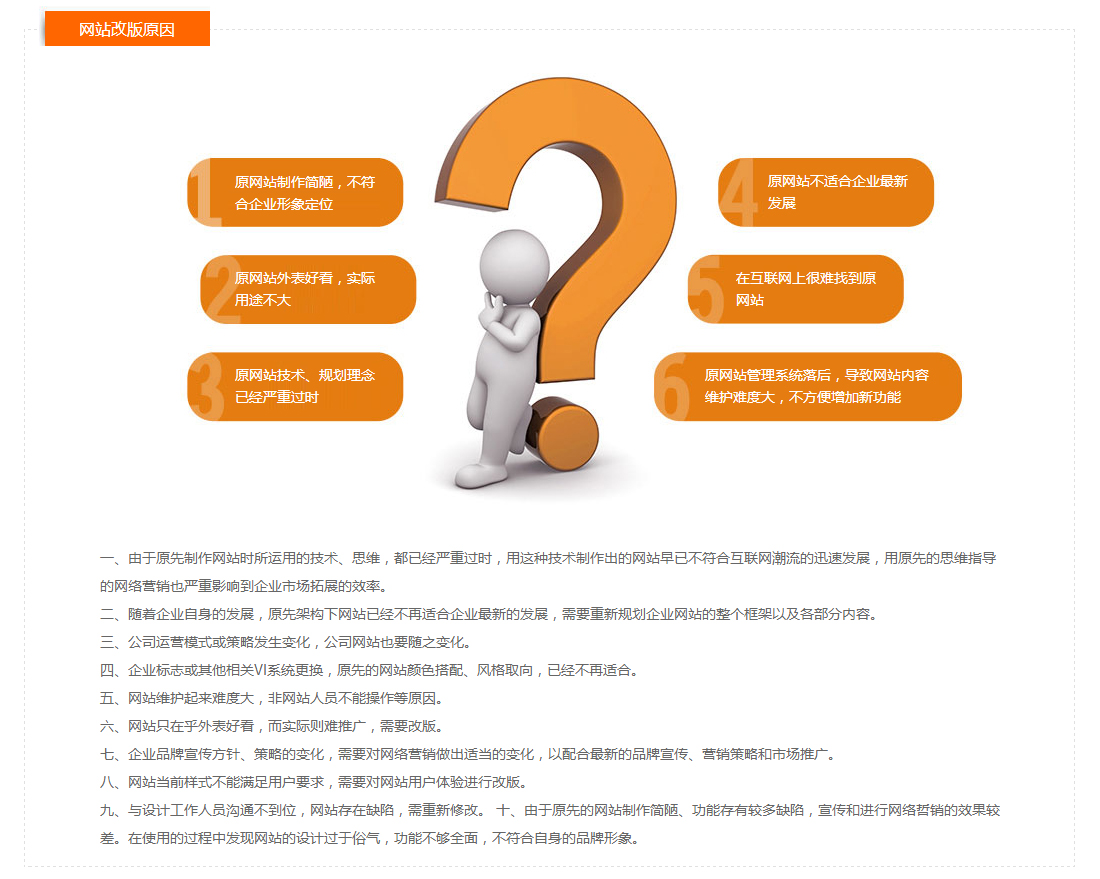網站(zhàn)整體(tǐ)診斷服務:網站(zhàn)改版不同于新網站(zhàn)建設,它已經具備了一定的曆史數(shù)據。我們可(kě)以根據這些(xiē)曆史數(shù)據,對原有(yǒu)網站(zhàn)整體(tǐ)診斷、分析并總結存在問題。